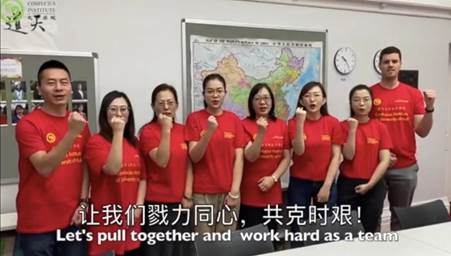闫嵩(左一)老师与英国赫尔孔子学院同事们发来的祝福视频