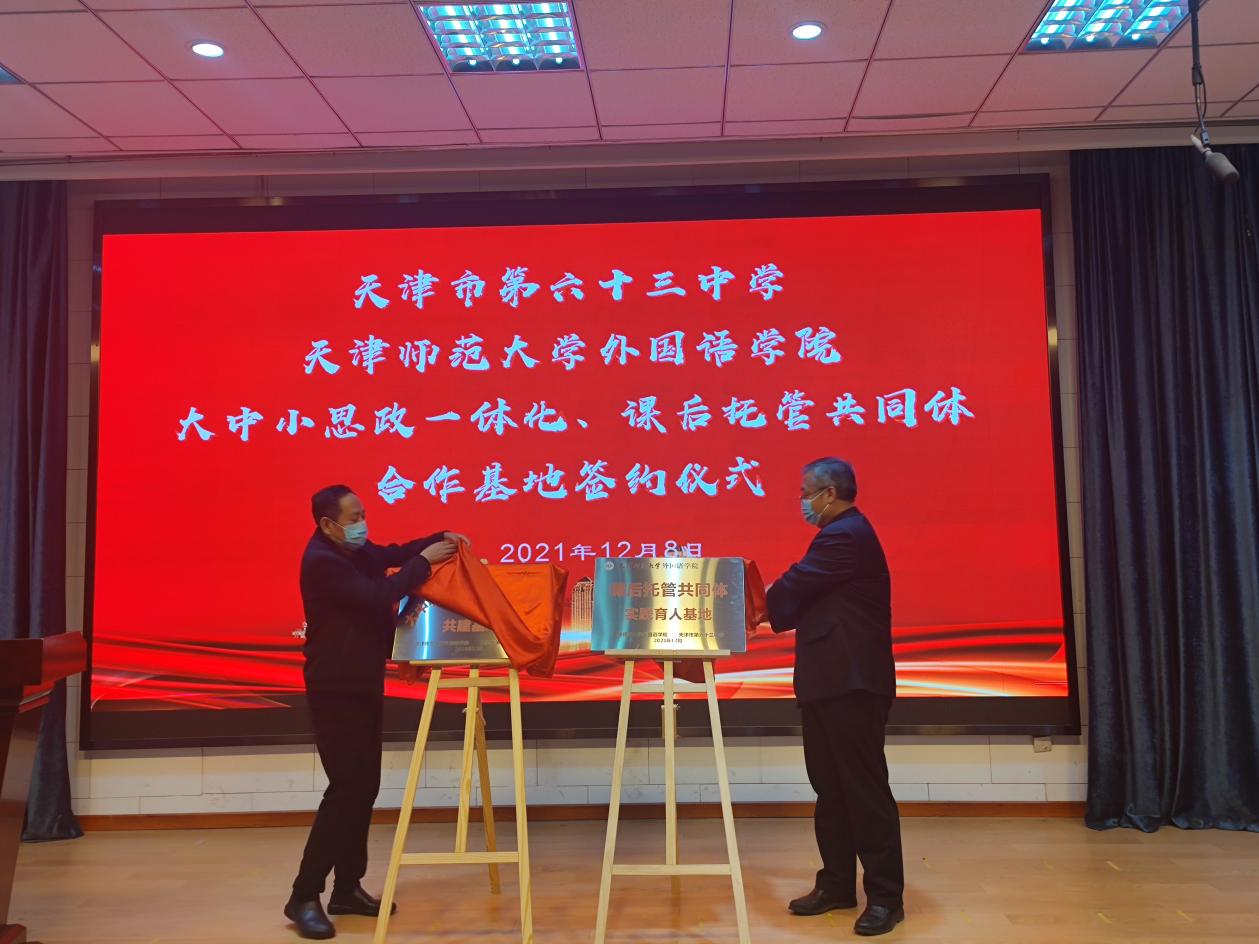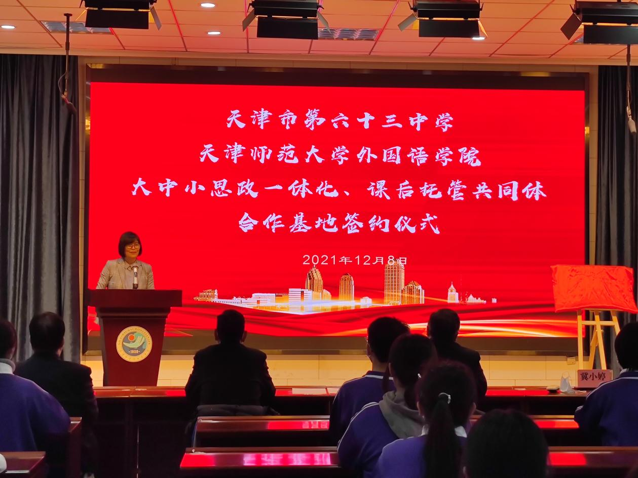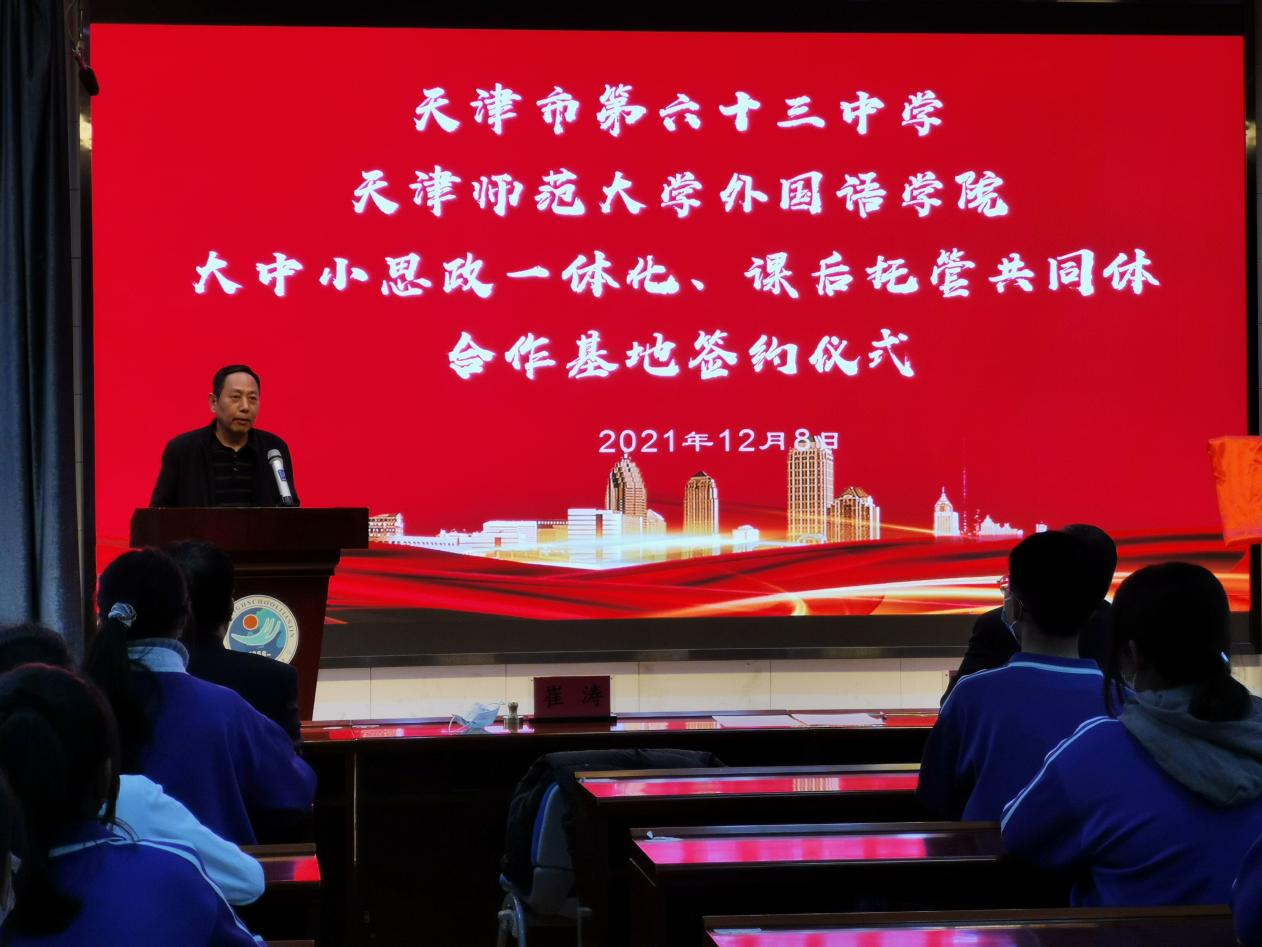 为更好落实立德树人根本任务,积极培育和践行社会主义核心价值观,充分发挥思政课育人的主渠道作用。我院携手天津市第六十三中学,共同探索实践“大中小思政一体化”建设,全力打造课后托管共同体。12月8日下午,合作共建签约仪式在天津市第六十三中学举行,党委书记张维和、党委副书记刘晓蕾、副院长冀小婷和团委书记宋倩,以及第六十三中学书记崔涛和相关负责老师、学生代表参加活动。