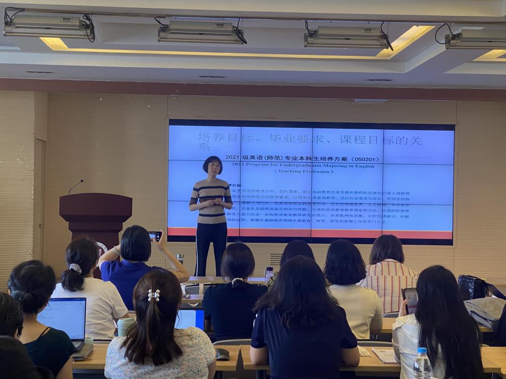 刘金娟老师以《英语文学导论》为例,从该课程对应毕业要求的矩阵出发,详细介绍了如何设定课程目标,以及课程目标如何支撑毕业要求。在课程目标达成环节,刘老师又介绍了如何通过设计教学内容、改革教学模式、设计评价依据等组织教学活动、达成课程教学目标、支撑毕业要求指标点,同时分析了有关教学活动安排对学生专业能力、教育情怀以及综合素质的提高发挥的作用。