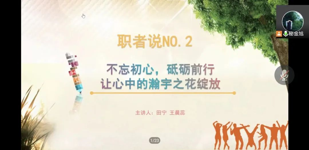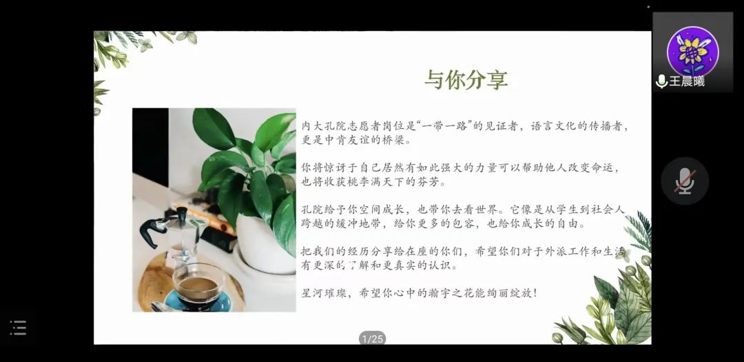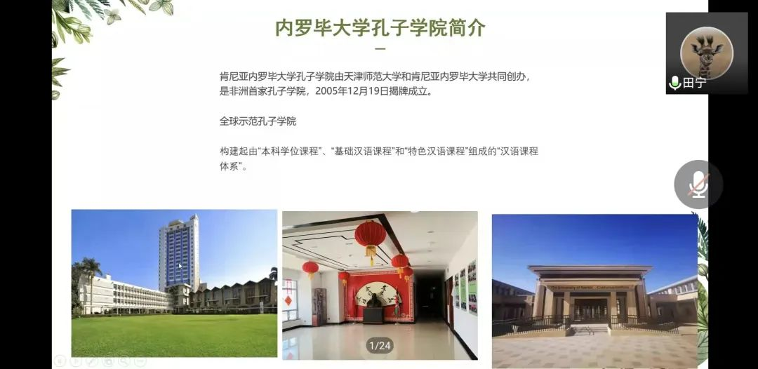 田宁、王晨曦同学曾任肯尼亚内罗毕大学孔子学院国际汉语教师志愿者,她们以“不忘初心,砥砺前行,让心中的瀚宇之花绽放”为主题展开了此次分享。