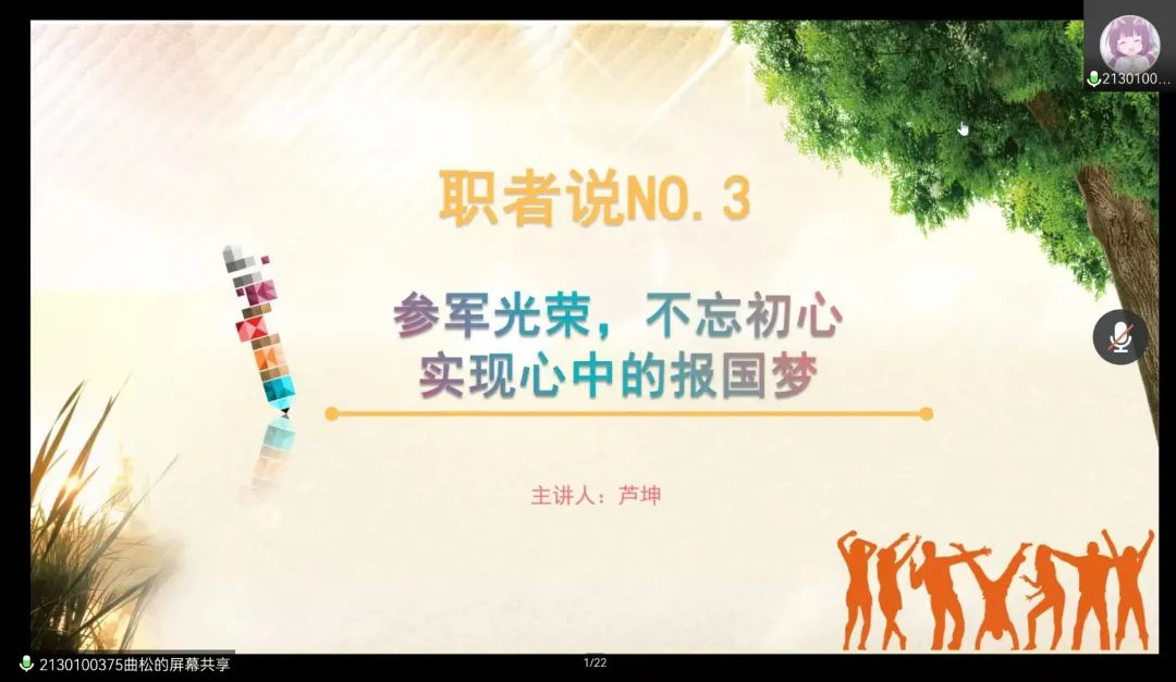 牢记初心报国志,雄心四海建功成。身着戎装好榜样,奋斗青春志远航。此次分享会使我院学子认清就业形势,知晓就业政策,鼓励和引导青年们展现新时代大学生青春活力,感恩社会,投身军营。凝聚青春力量,接力百年征程。
