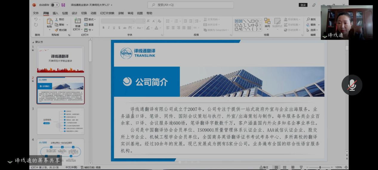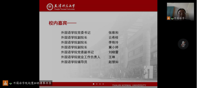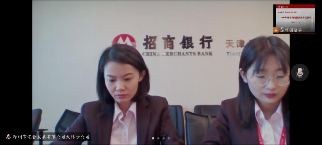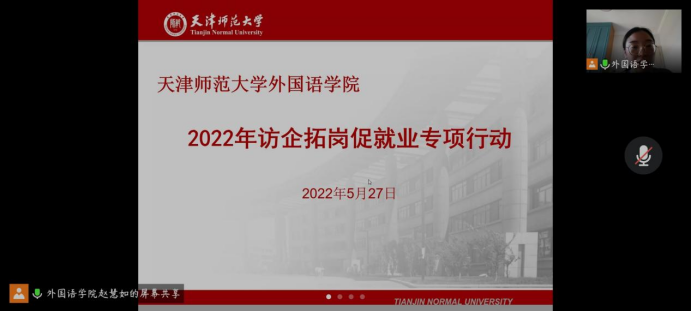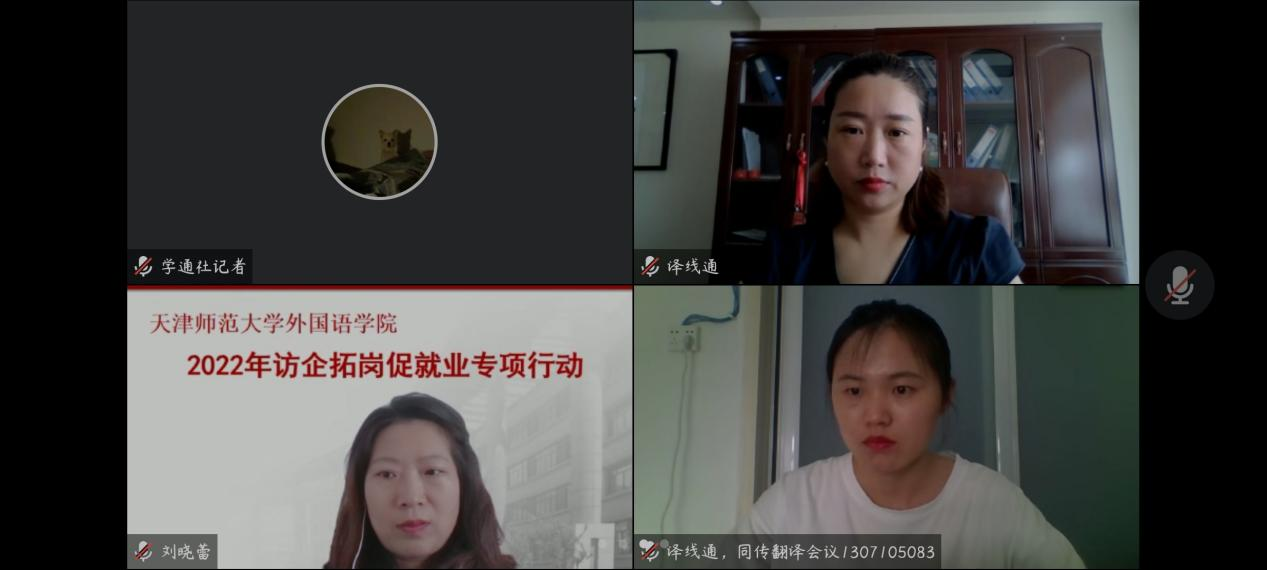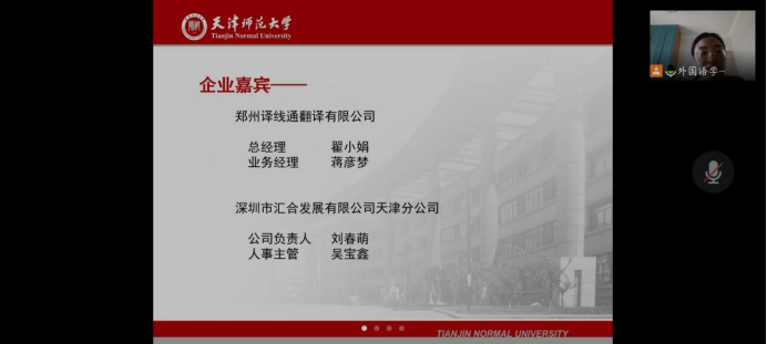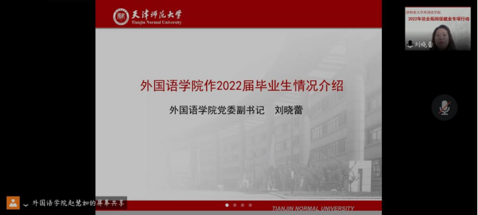 活动伊始,刘晓蕾老师为各位与会嘉宾介绍了我院2022届毕业生情况。郑州译线通翻译有限公司与深圳市汇合发展有限公司天津分公司相继介绍本单位情况及2022届毕业生招聘需求。随后,我院领导与企业代表就双方关心的问题进行洽谈交流,增进了双方的认识和交流。
