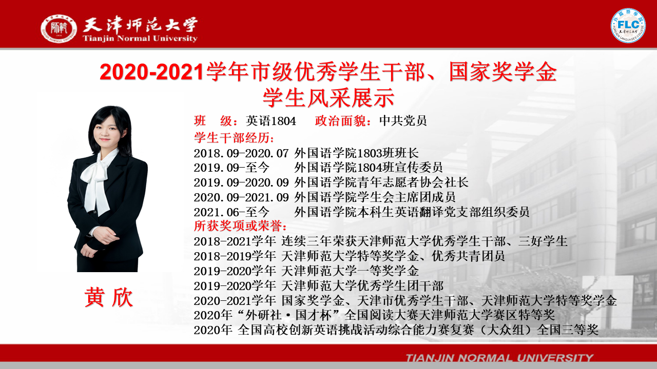 2020-2021学年市级优秀学生干部、国家奖学金获得者——黄欣