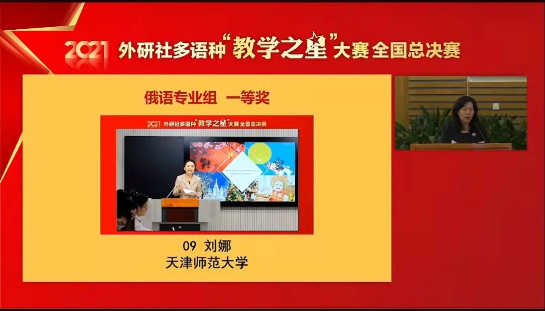 在12月12日的俄语专业组全国总决赛中,刘娜老师将课程思政与文化元素完美导入外语课堂,传统外语教学方法与现代信息技术相结合,以巧妙创新的教学设计、具有亲和力的课堂展示、流利的口语表达,赢得评委的一致好评,获得外研社多语种“教学之星”大赛一等奖。