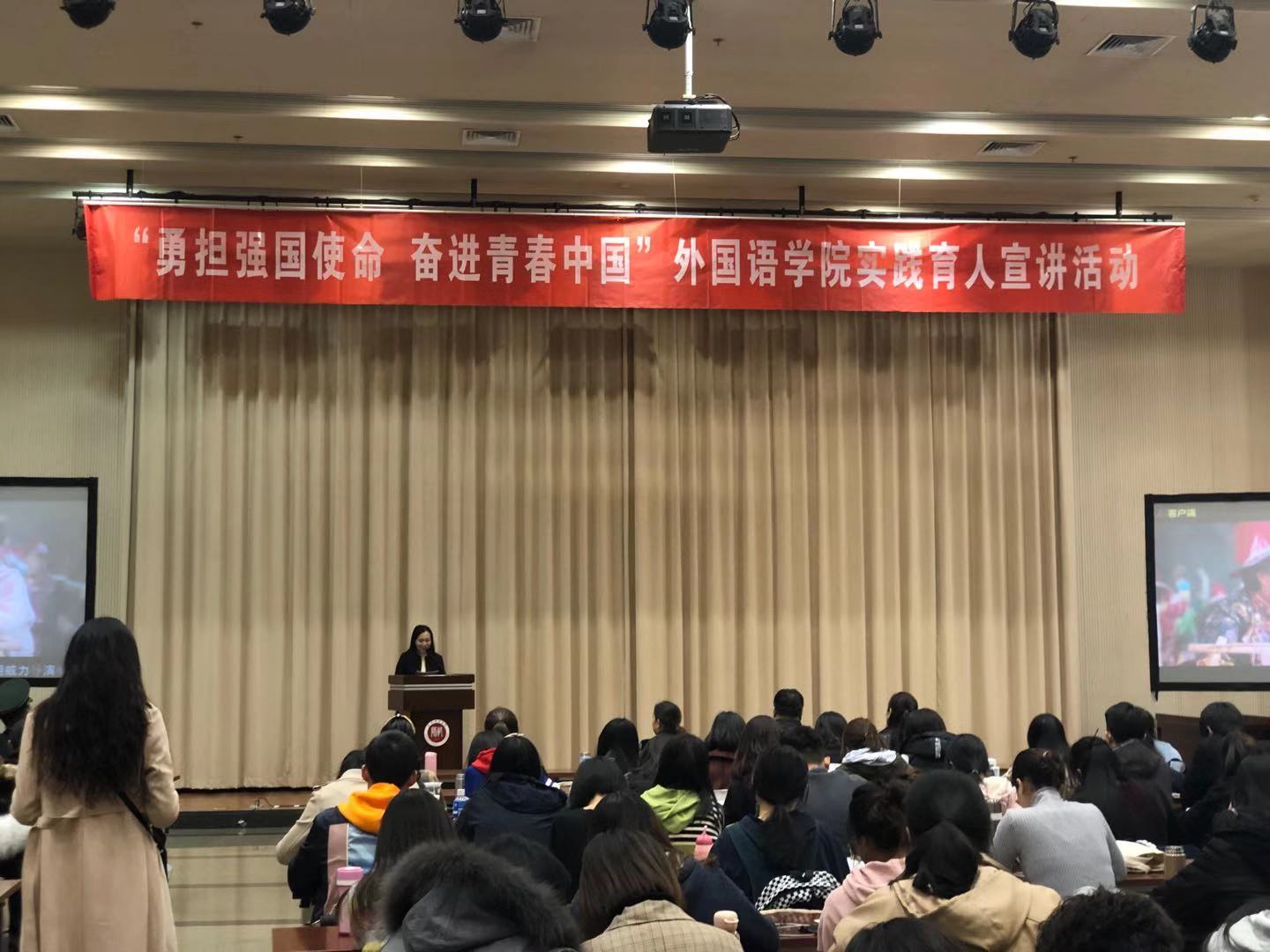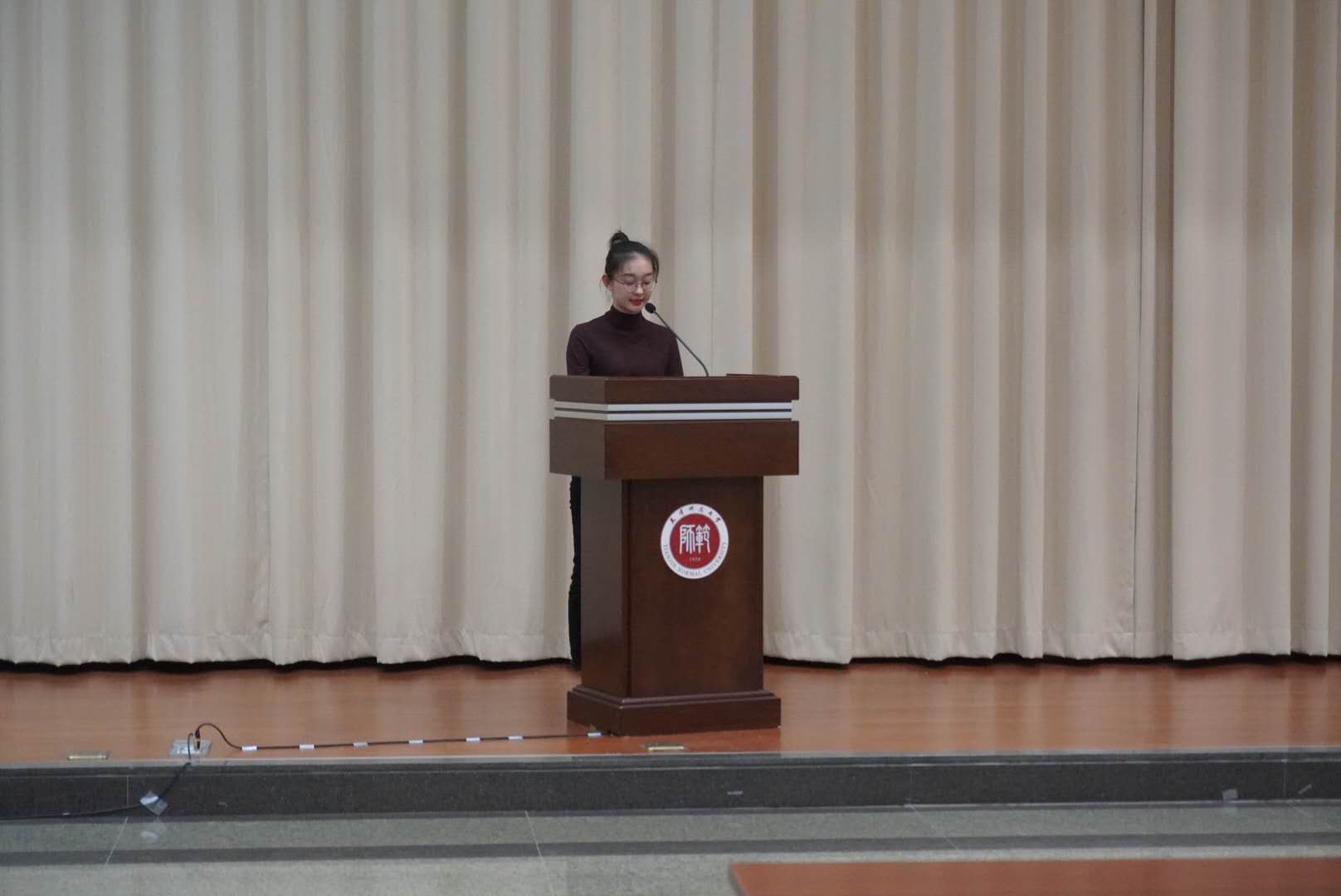 宣讲共分为三个部分,第一部分为“奋斗的青春最美丽”,在院青年志愿者日常志愿服务侧影展示的短片播放后,外院青协负责人1801班黄欣同学讲述了她在太阳村志愿服务的经历,介绍了多年来外院青年志愿者扎根基层,接力相传志愿服务精神的动人故事。